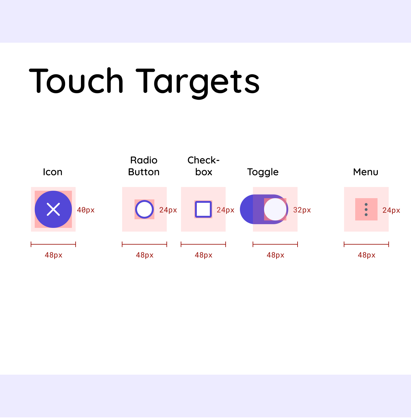 The design system also accounts for users with motor disabilities by calling for larger touch and pointer targets with generous amounts of padding around the interactive element.