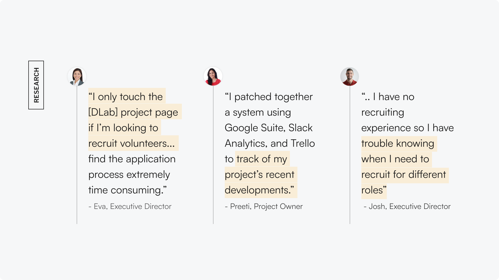 Naturally, the question we want to ask as designers is "Are we solving the right problem?", so we conducted user interviews with 12 project owners on DLab. From these conversations, we discovered that while Mark was on the right track, the clumsy applicant portal was just one of many challenges facing project owners.