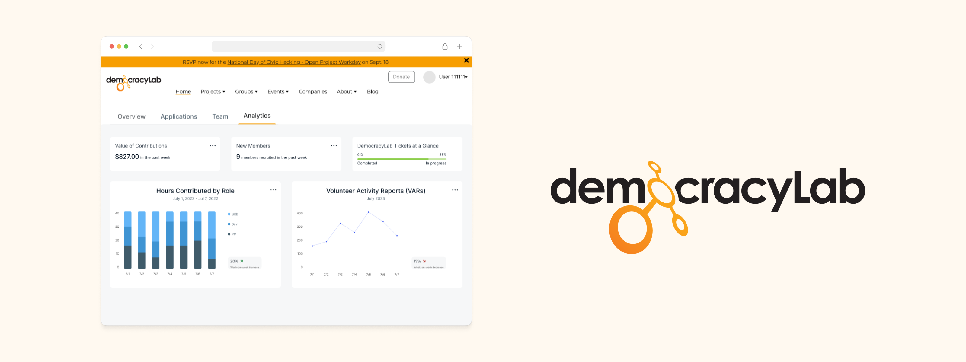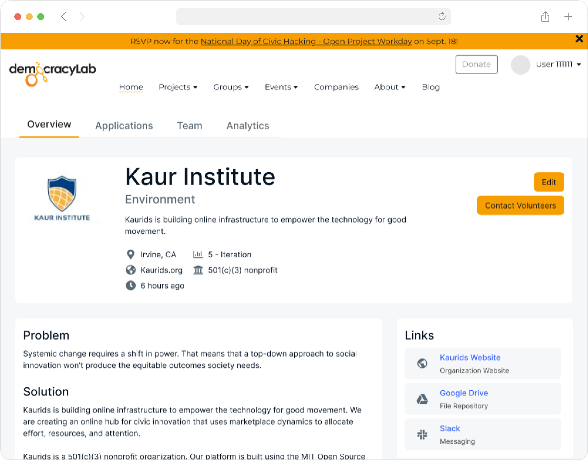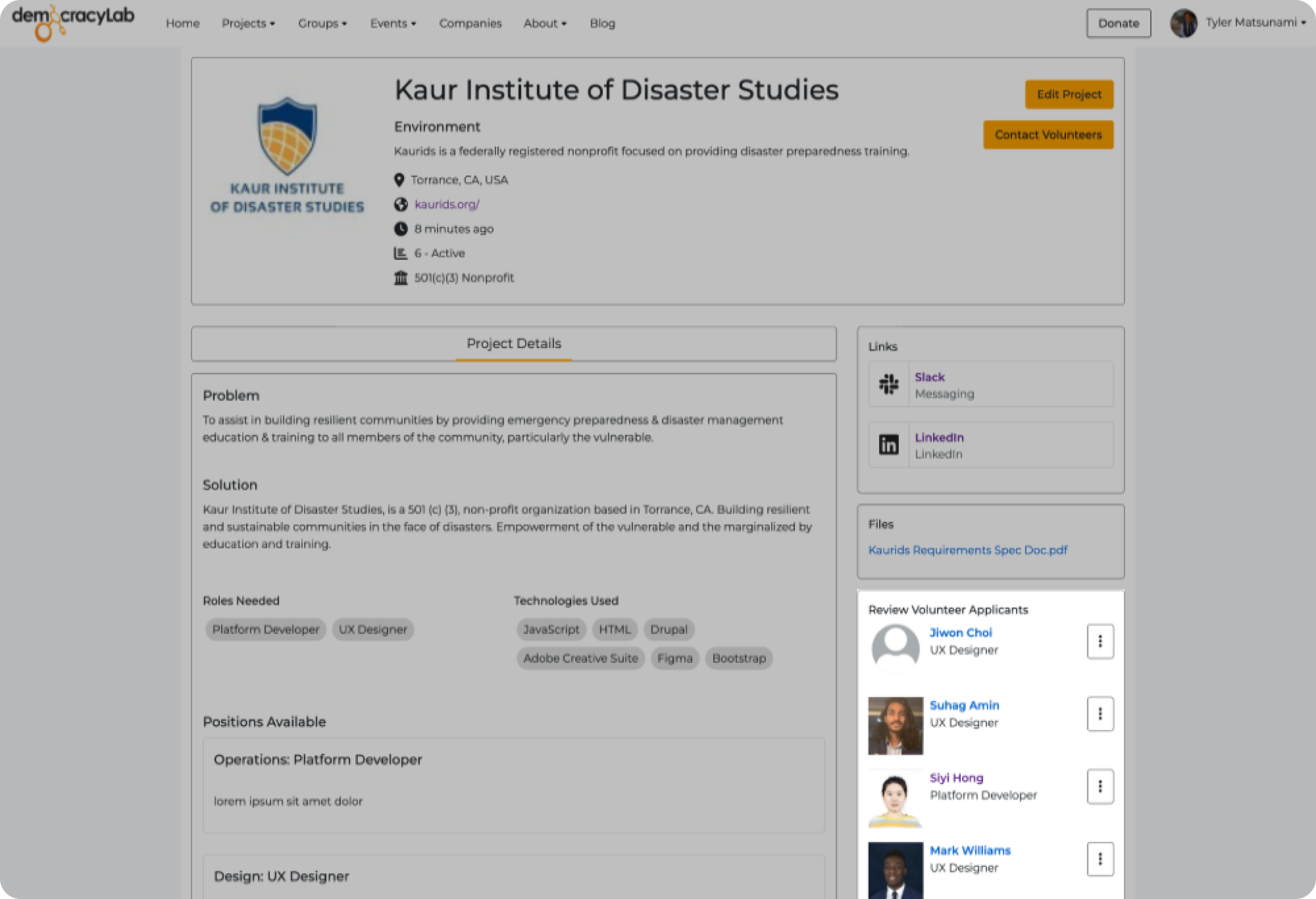 DemocracyLab (DLab in shorthand) is a social impact organization that connects professionals who are willing to donate their time with nonprofits. DLab's website allows project owners (nonprofit leaders) to post opportunities, and prospective volunteers can apply to roles that match their skills and interests.