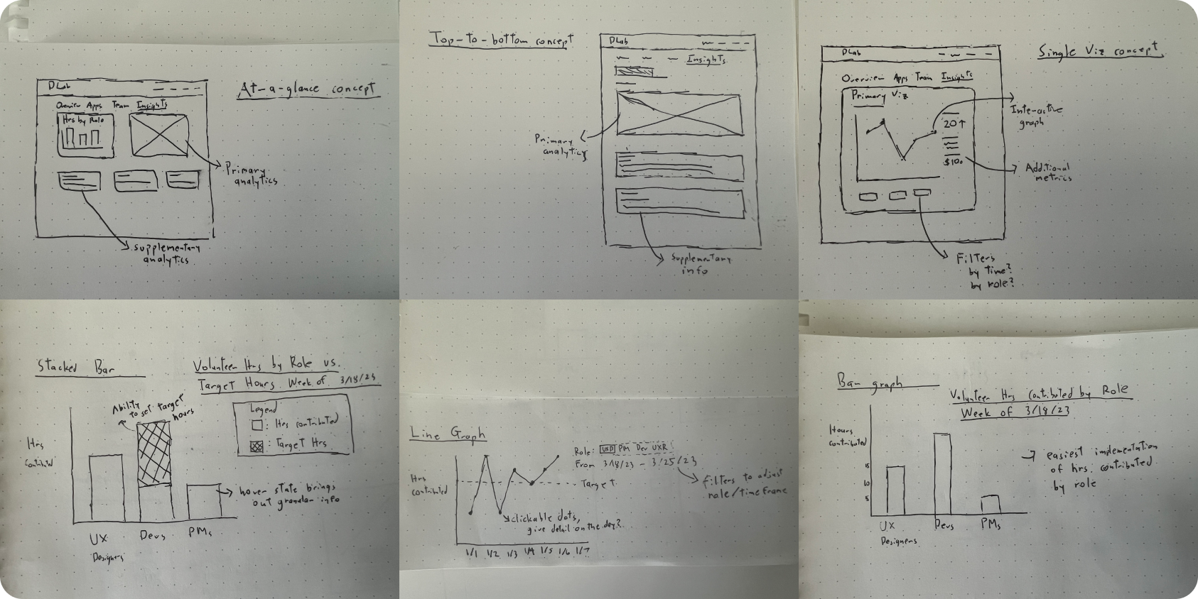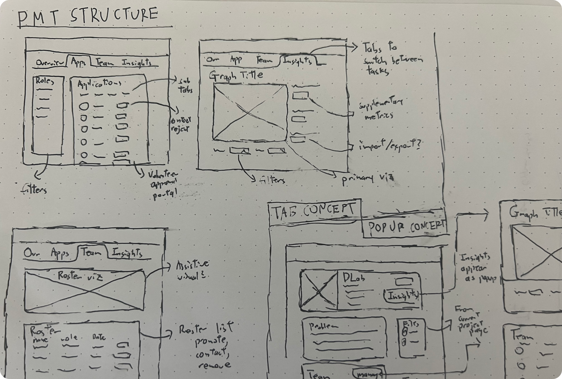 After synthesizing our research and compiling a list of MVP specs, I began to sketch out ideas for the PMT's structure, analytics tab layout, and data visualization methods.