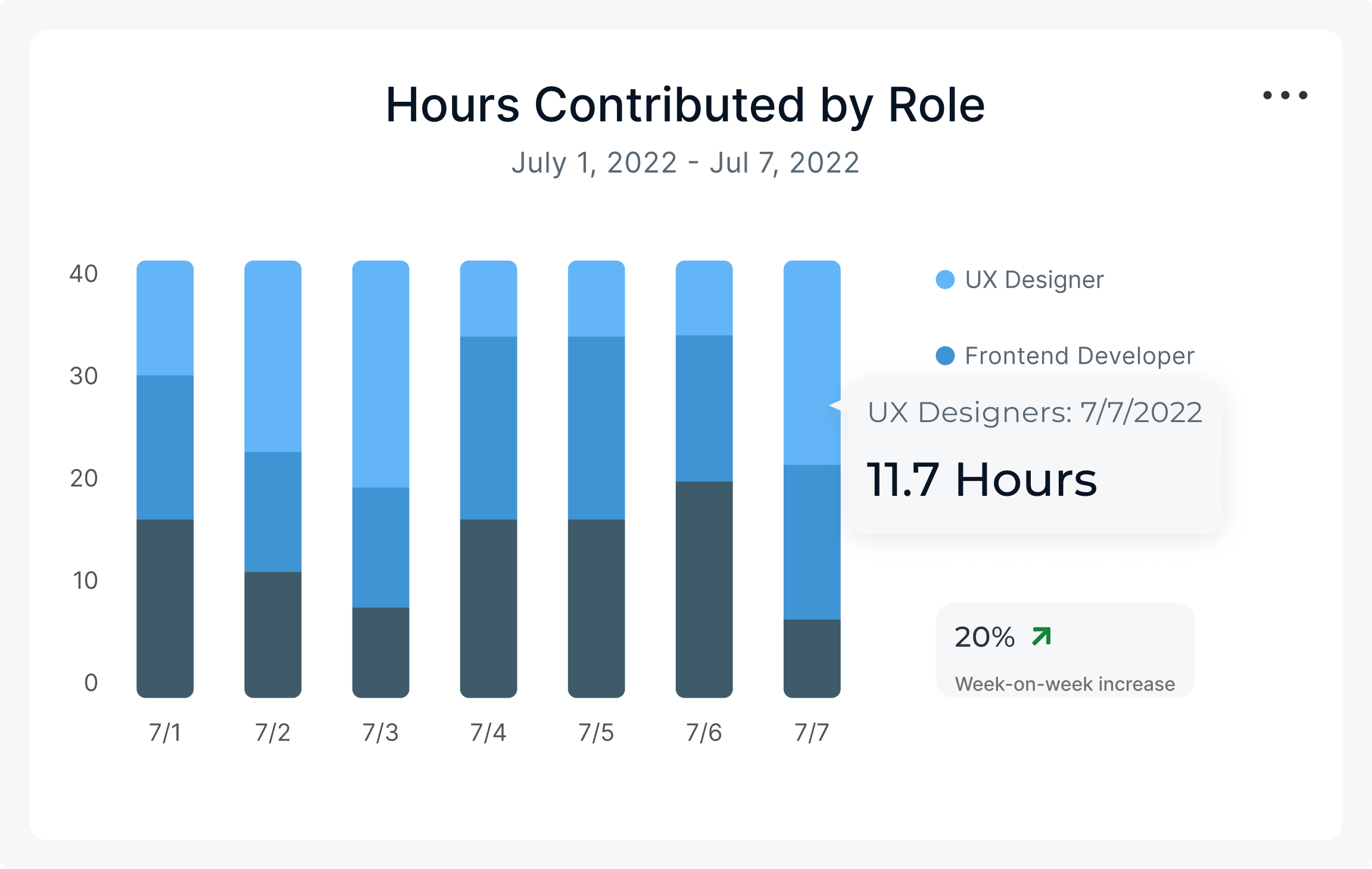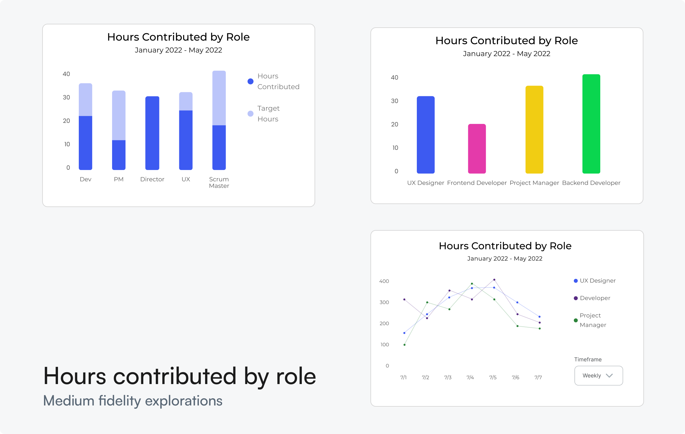 I explored various data visualization models for the analytics tab to help project owners make staffing decisions. I settled on a stacked bar chart to represent the number of hours contributed by role, because it provides the best at-a-glance breakdown of contributions by role.