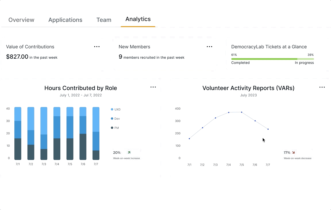 Nonprofit leaders patched together (ie: Slack analytics) to source project metrics. This data is vital to secure funding from external stakeholders.