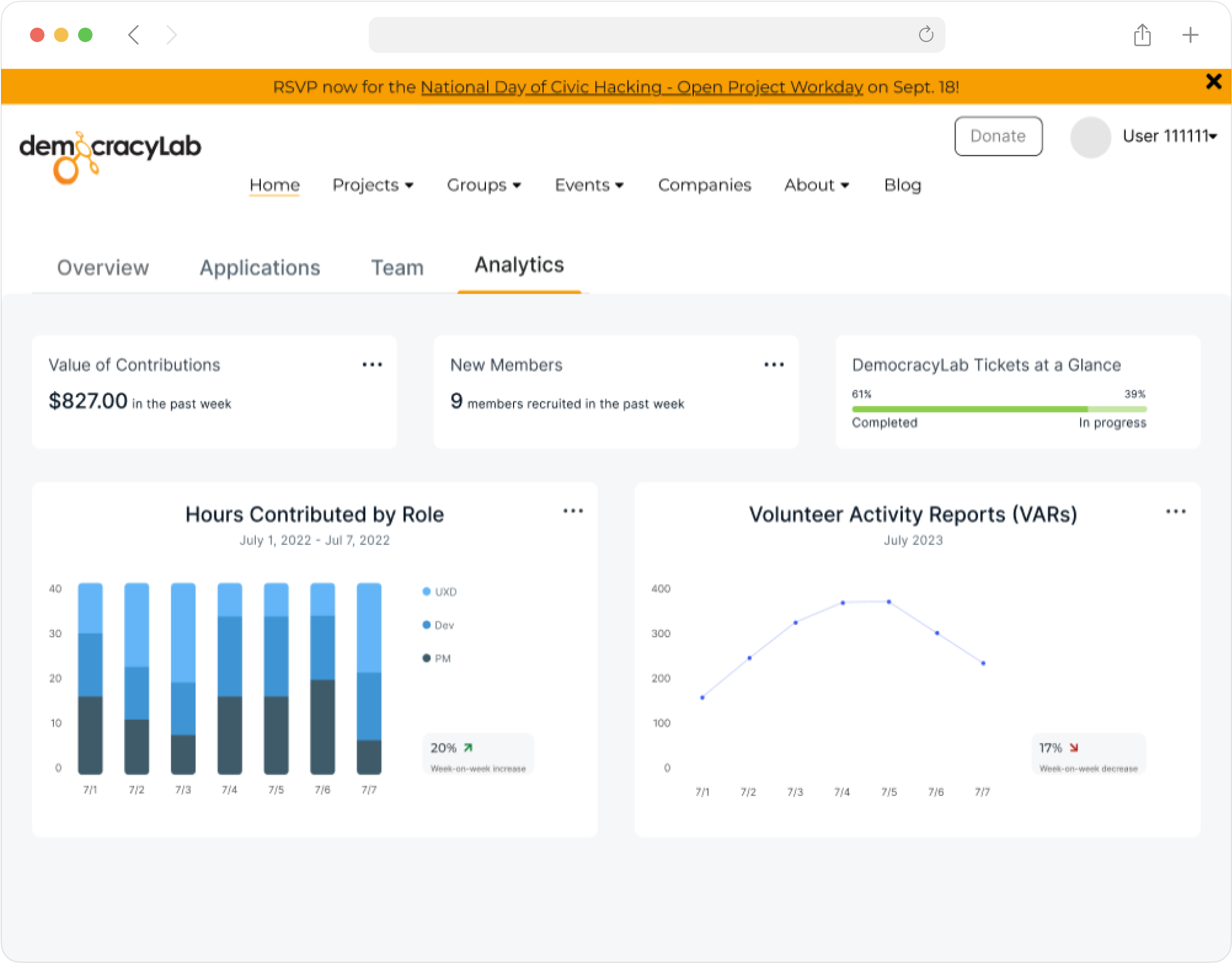 I compiled my design work for the "Hours by Contributed by Role" graph, VAR line graph, and supplementary metrics, and placed them in the Analytics tab. During this stage, I also proposed to revamp DemocracyLab's dated visual design language, as shown below.