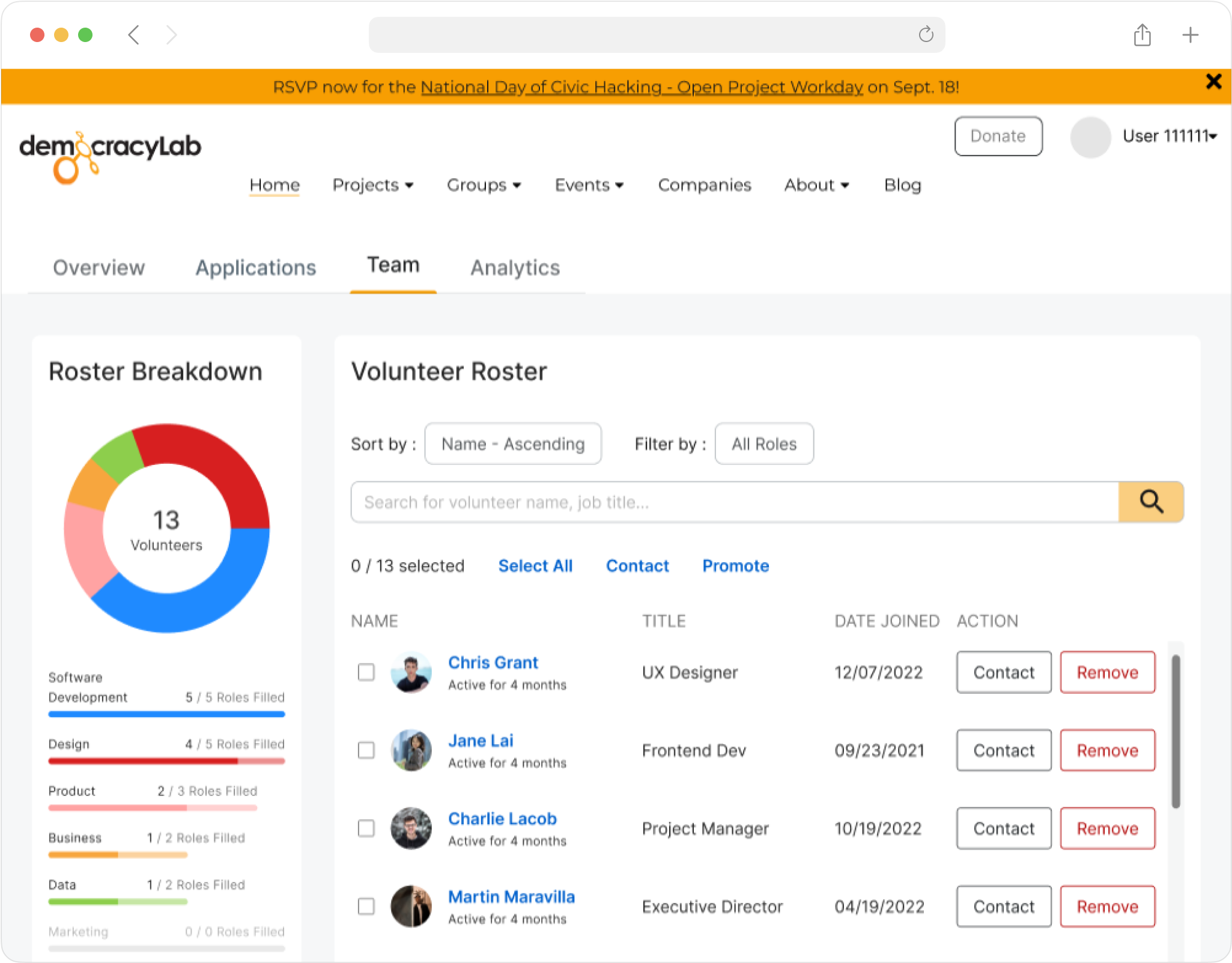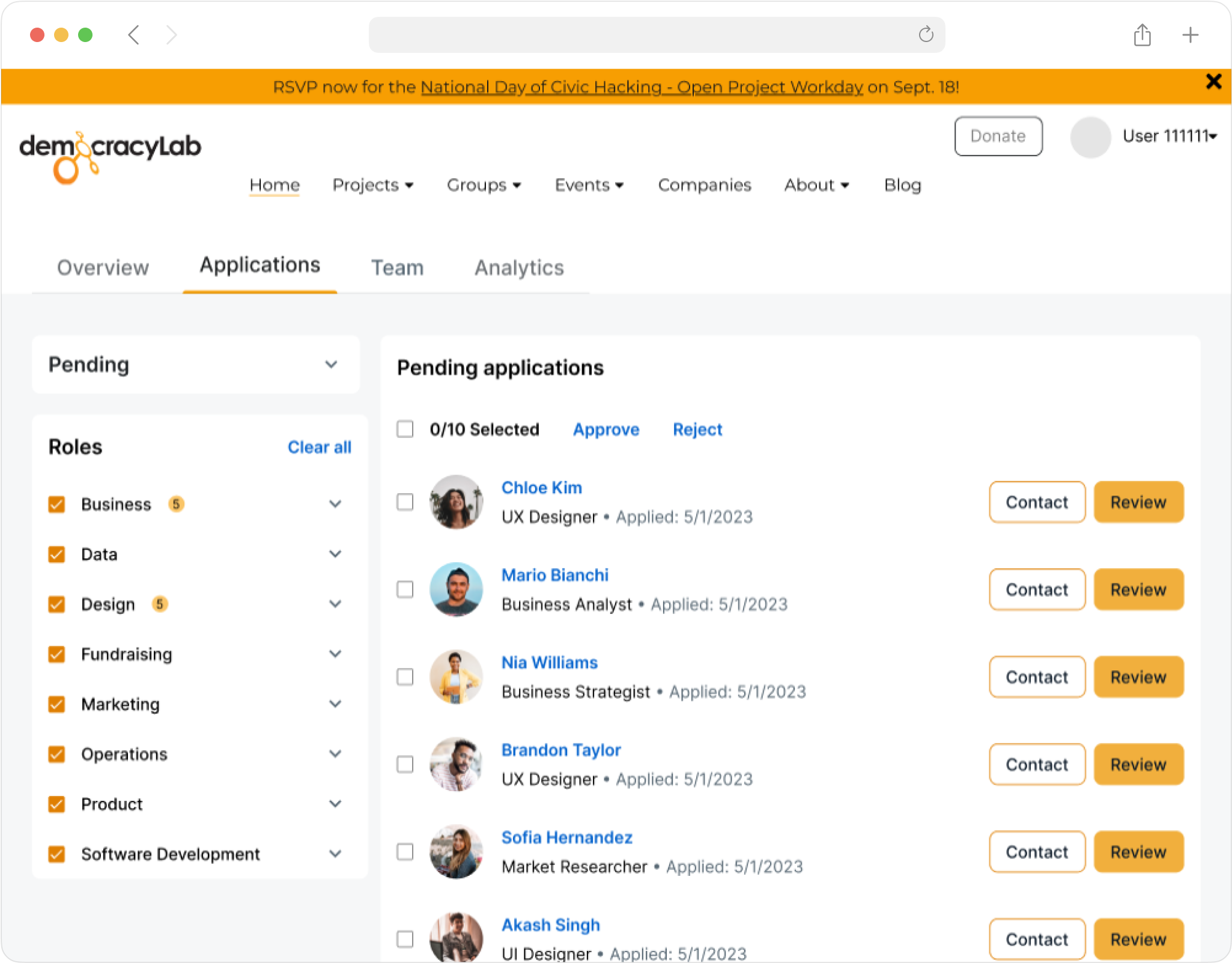 Earlier this year, Mark, DLab's Executive Director, identified a problem where only 30% of volunteer applications were being viewed on the website's project pages. Mark tasked our team with revamping the applicant portal in order to streamline the approval process and increase the number of active volunteers on DLab's platform.