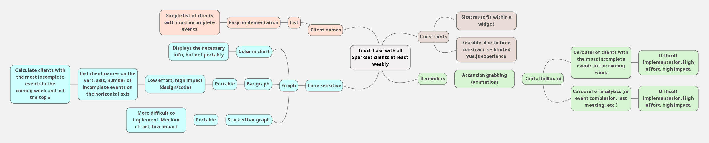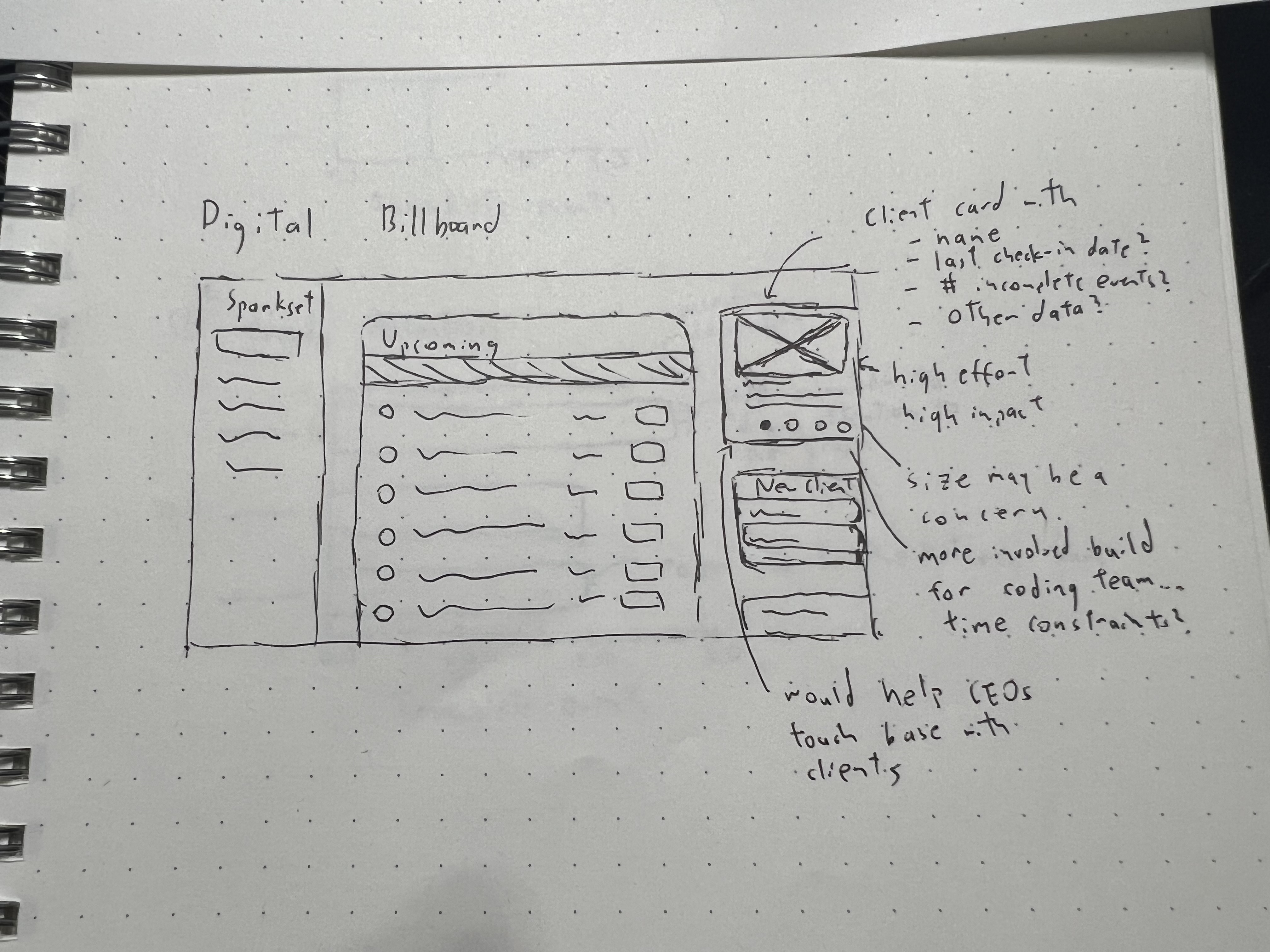 Around this time, we also uncovered that an important part of digital marketers' workflows is to “triage clients and figure out who needs the most help." We saw this as an opportunity to improve the overview page's usefulness and started ideating sidebar additions with a mindmap.