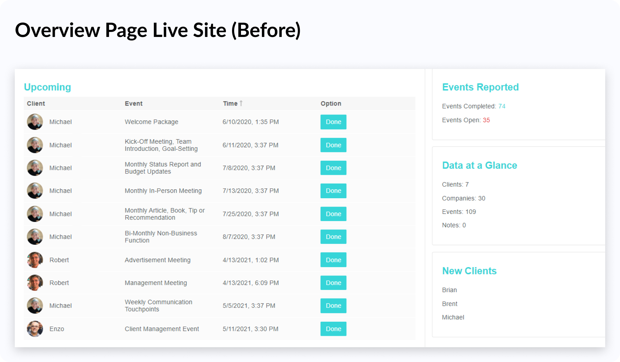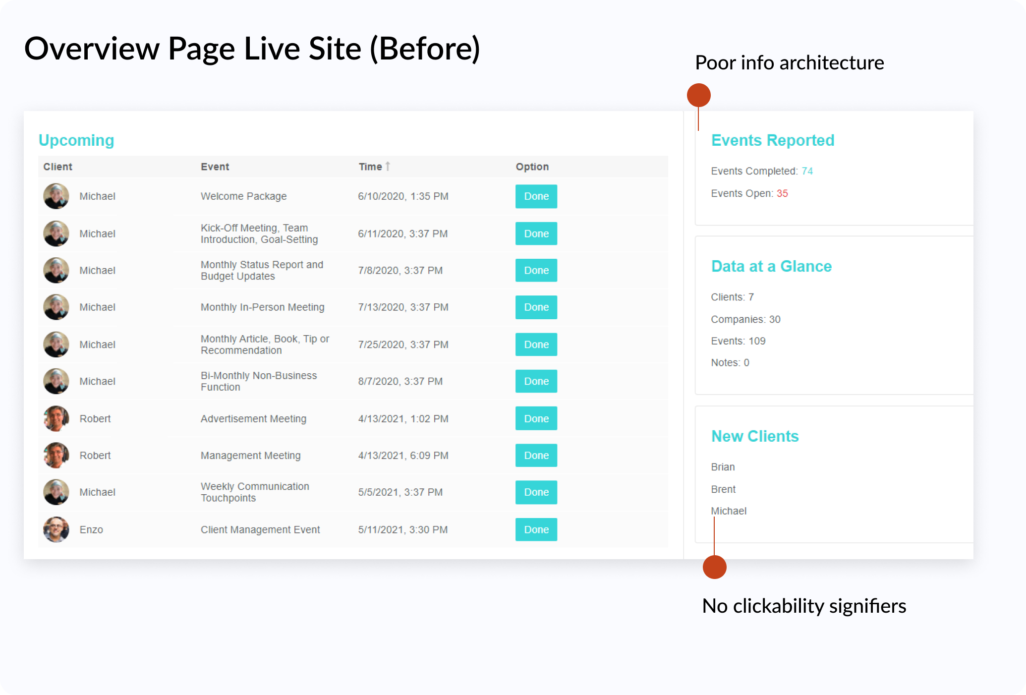 X An example of a usability issue could be seen on the overview page, where usability test participants missed the "New Clients" widget because there were no signifiers that implied clickability.