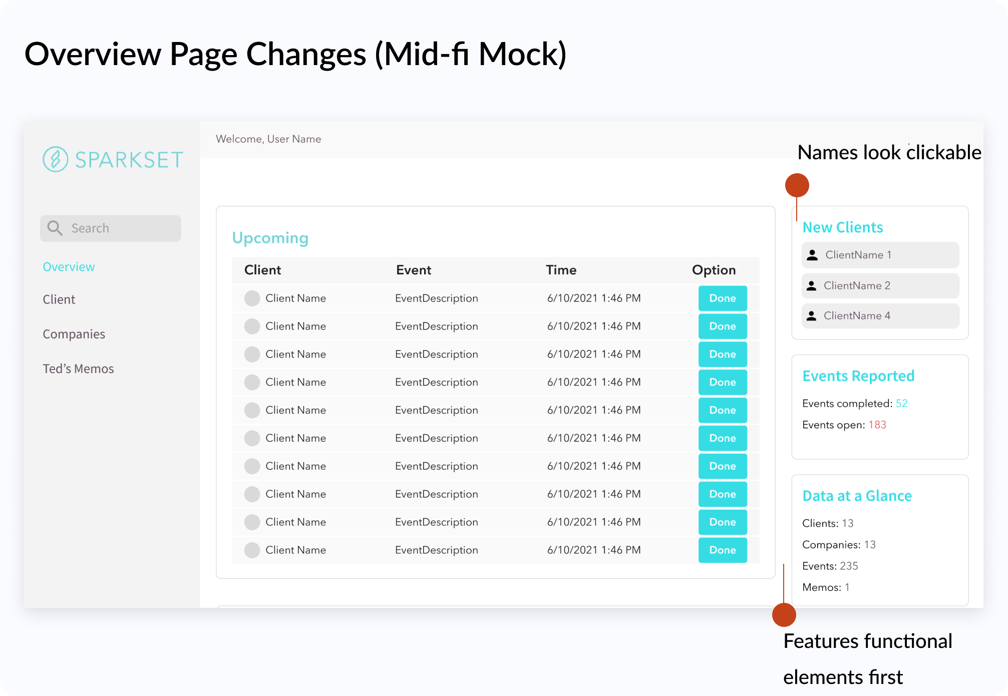 ✅ To remedy the above issue, we gave clickability indicators to the names in the "New Clients" widget so that users will see that the component is interactive.