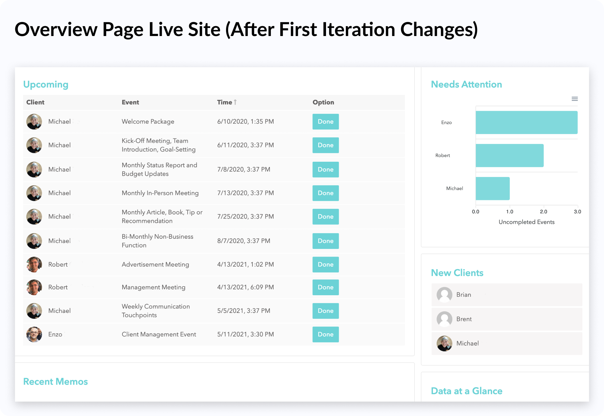 My team selected the "Needs Attention" graph as our solution because it was impactful while still satisfying the time and development constraints that we faced. This feature would list the three clients with the highest number of incomplete events in the upcoming week, along with a corresponding graph showing the number of incomplete events for each client.